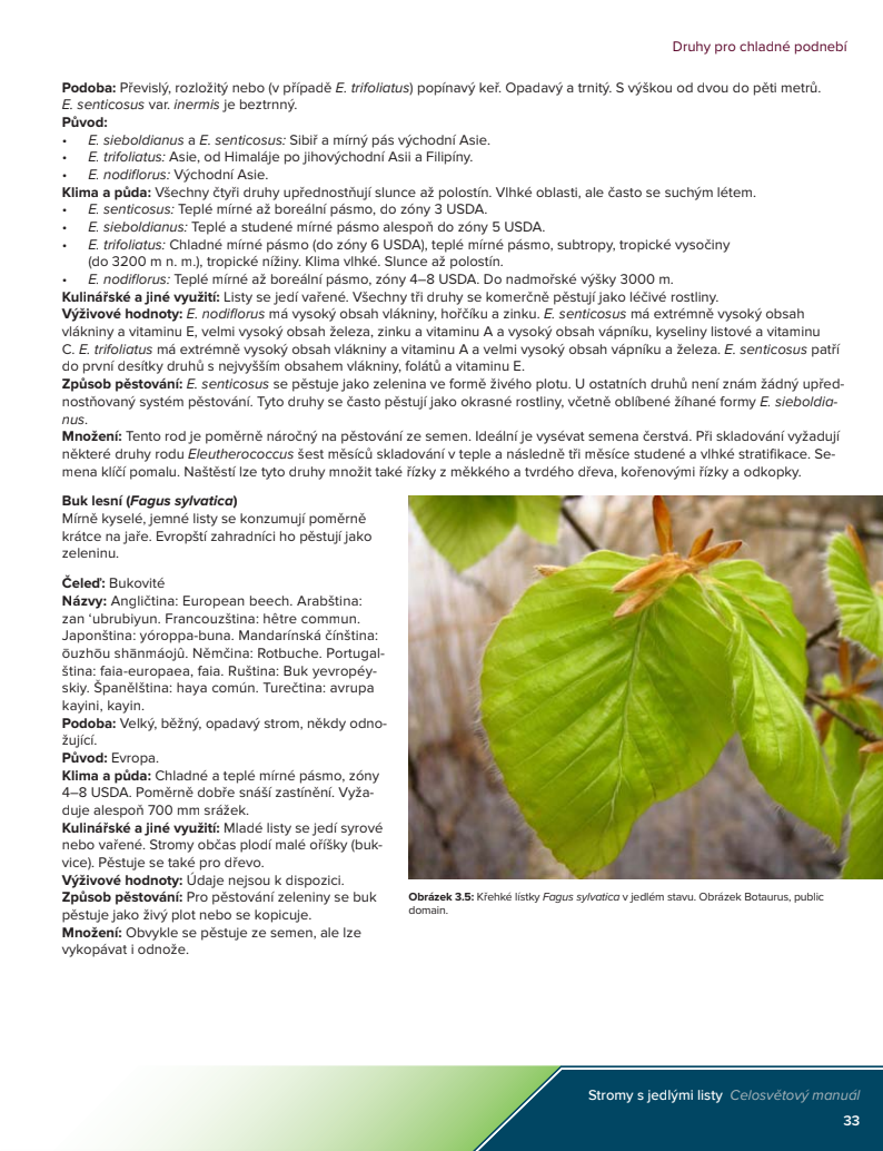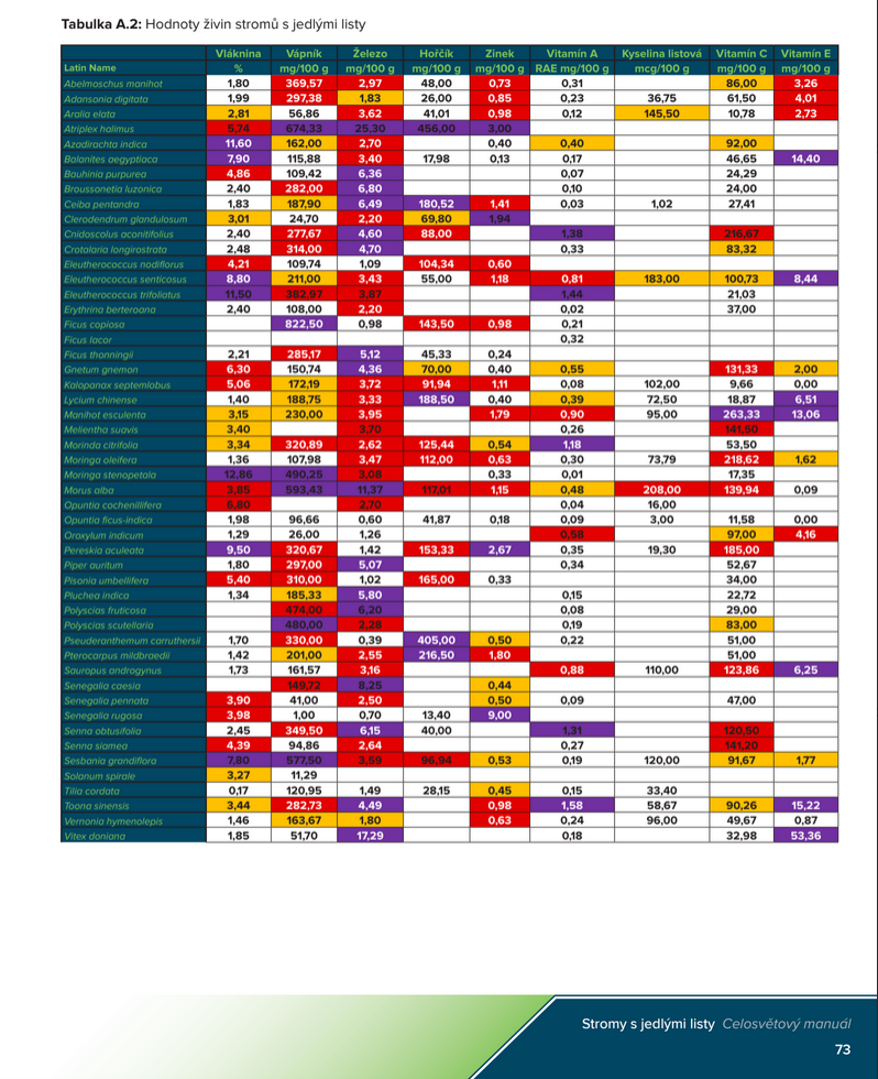Tato publikace představuje 102 druhů stromů, keřů a kaktusů, které se pěstují pro jejich jedlé listy a výhonky. Pokud je nám známo, tyto informace nebyly dosud nikdy shromážděny na jednom místě.