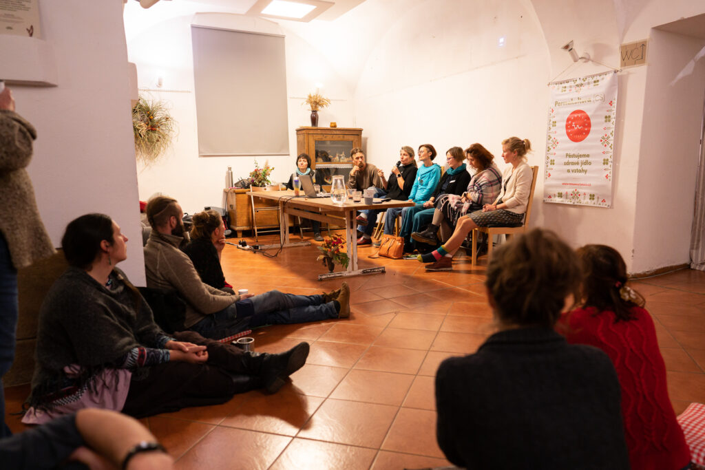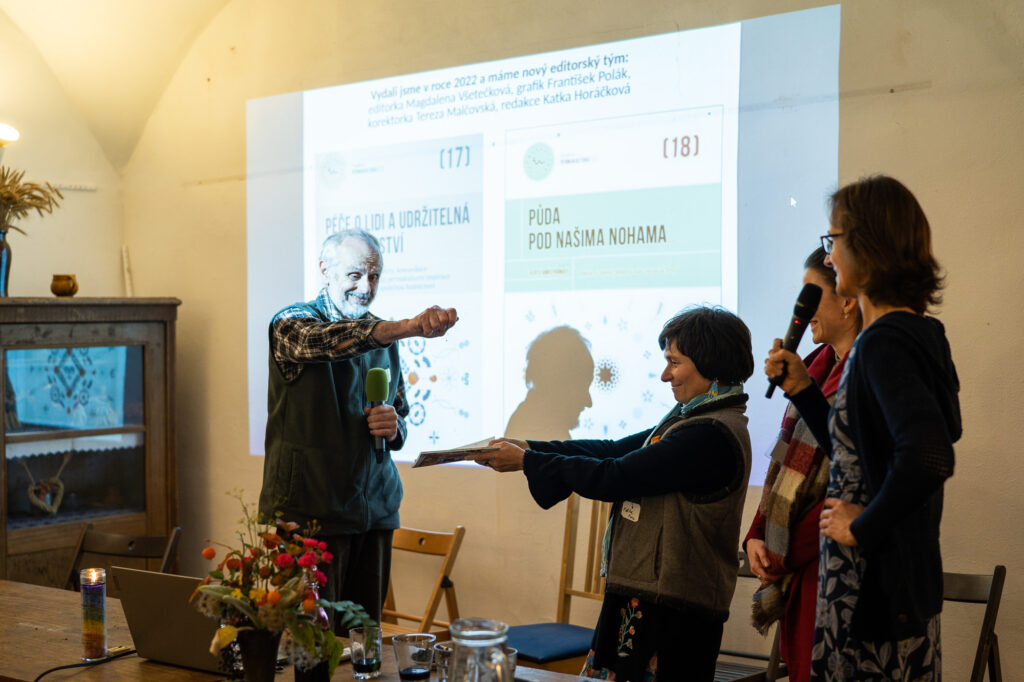 Odvážil jsem se zlehka otevřít dveře a překvapení bylo na světě. Nebo spíš jsem vstoupil do jiného světa. Jitka s Lenkou u stolečku hned za dveřmi si mě našli v seznamu hostů a uvedli mě svými úsměvy. Pomaličku jsem se posunul jen pár kroků dál podél stolů, na kterých bylo asi dvě stě pestrobarevných knih o permakultuře. Všechny musím mít. To je jasný. Koupil jsem si dvě – Zahradu Gaii a Půdní život od Ladislava Mika. Sedl jsem si tiše do zadní řady na kraj a začal si listovat barevné knihy. Všude rostliny a hlína a a…. No prostě to všechno, co mám tak rád.