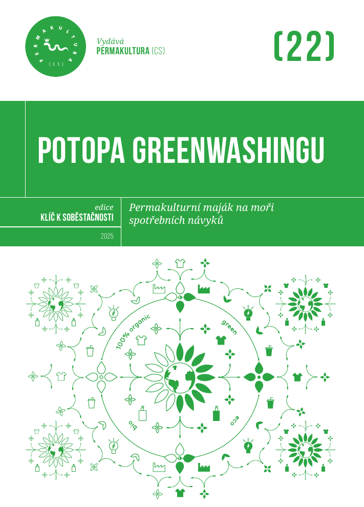 22. Potopa greenwashingu – maják na moři spotřebních návyků (2025) Publikace pomáhá čtenáři vyznat se v nepřeberném moři výrobků i služeb pomocí permakulturních principů a zvolit ty, které nezatěžují životní prostředí. Greenwashing je jedním z nástrojů, jak firmy zisk maximalizují, aniž by bylo nutné změnit finančně výhodné výrobní procesy. Stačí předstírat, že je jejich produkt šetrný k životnímu prostředí, přesvědčit o tom spotřebitele, a je vyhráno. A tak je skutečně obtížné zvolit z tisíců produktů v nekonečných regálech ty, které životní prostředí skutečně chrání, anebo alespoň ty, které mu nepřidávají zátěž. Publikace jako maják svým světlem navádí, kudy se při spotřebě vydat – neradí přímo, jaké výrobky kupovat. Potopa greenwashingu v obchodě.