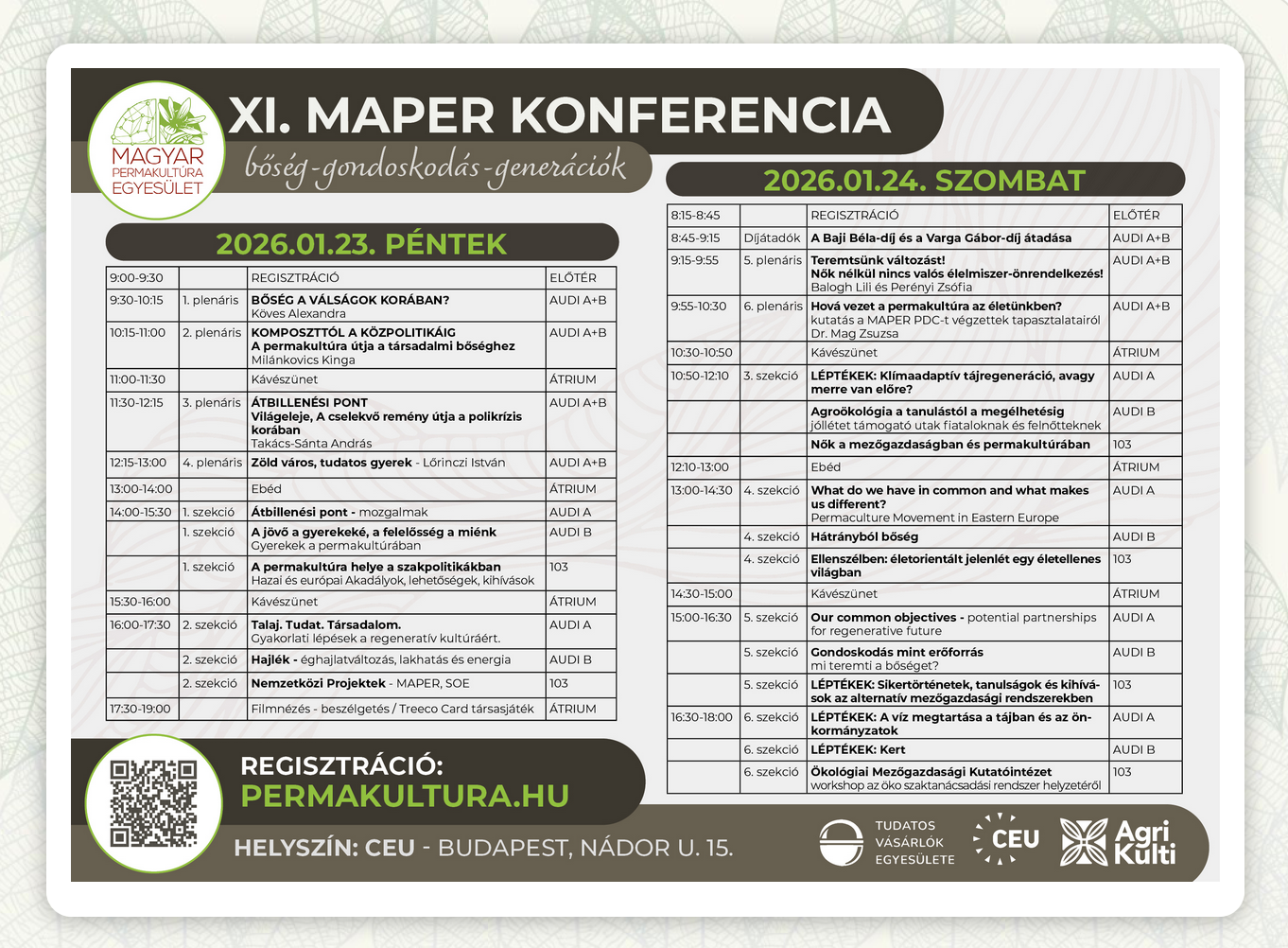 MAPER – maďarská národní permakulturní asociace pořádá 11. permakulturní konferenci 23. a 14.1.2026 v Budapešti. Část programu bude v angličtině, a tak tady s vámi sdílíme nástřel programu. V sobotu