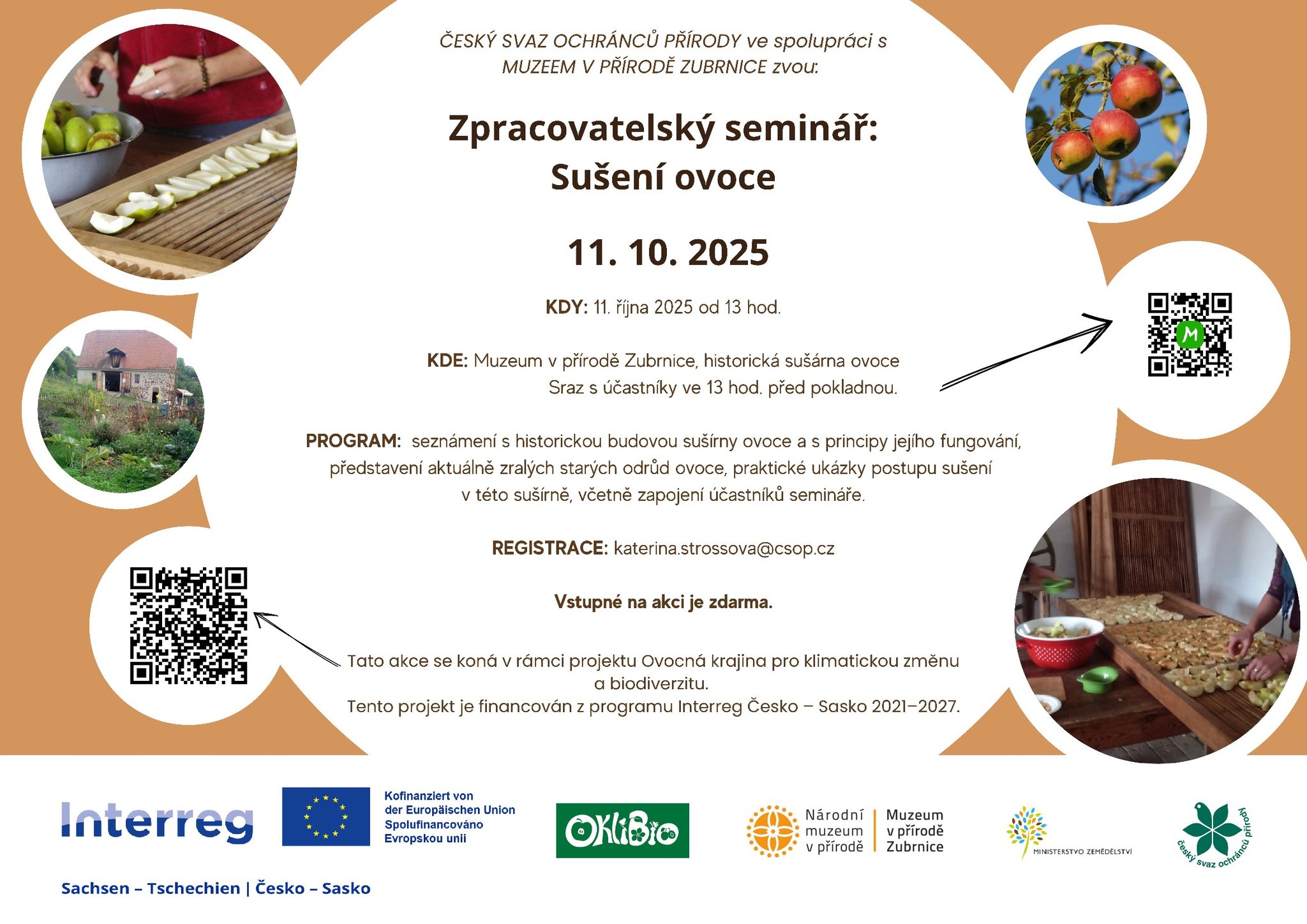 Ve spolupráci s Českým svazem ochránců přírody se v Muzeu v přírodě Zubrnice uskuteční v sobotu 11. 10. 2025 Zpracovatelský seminář: Sušení ovoce. Návštěvníci se seznámí s historickou sušárnou ovoce a ukázkami postupu sušení. Sraz účastníků ve 13:00 hod., nutná předchozí rezervace: katerina.strossova@csop.cz.