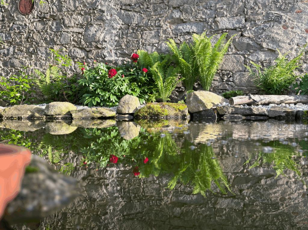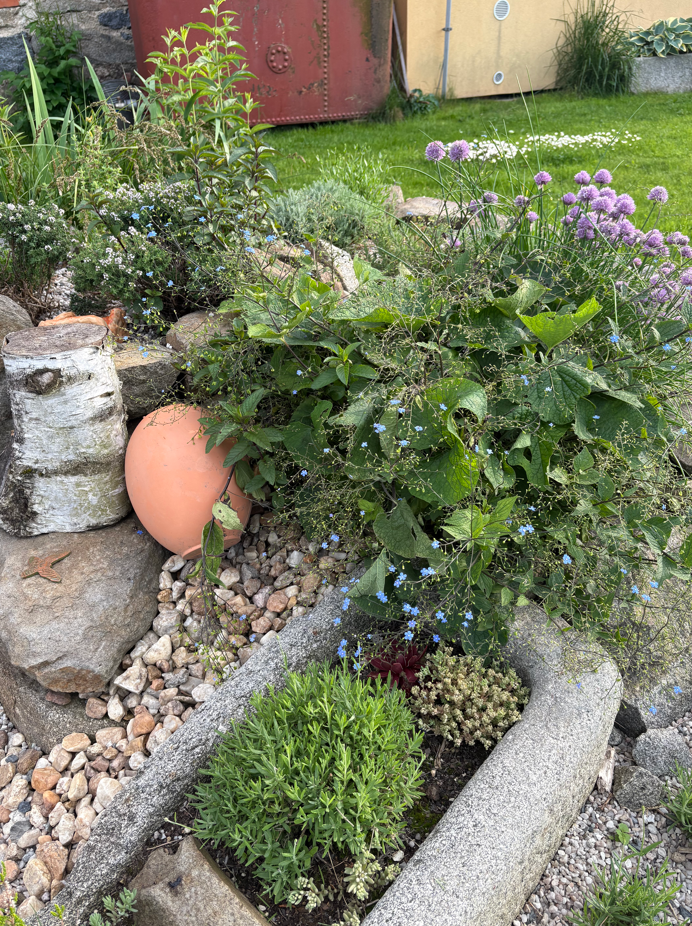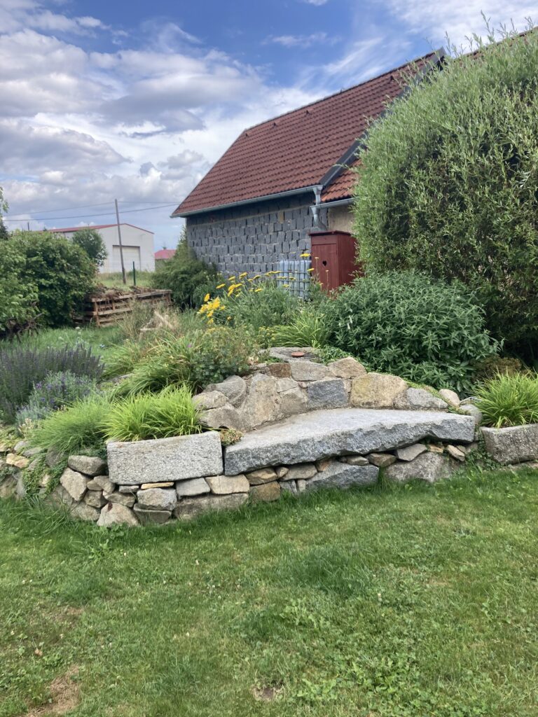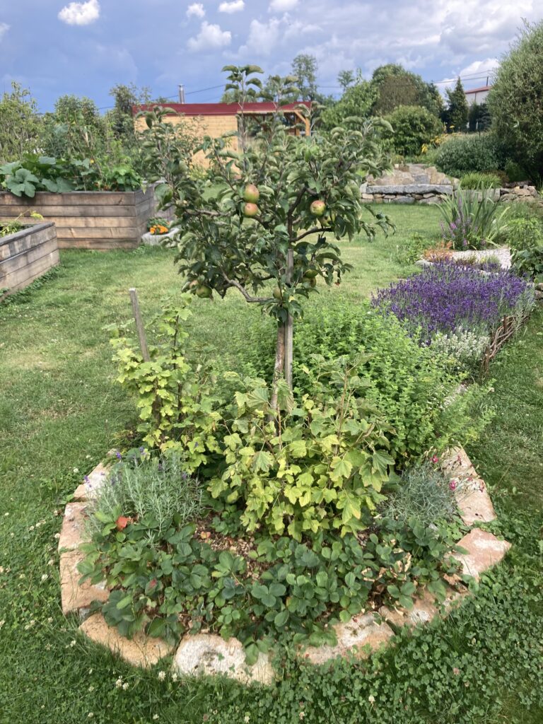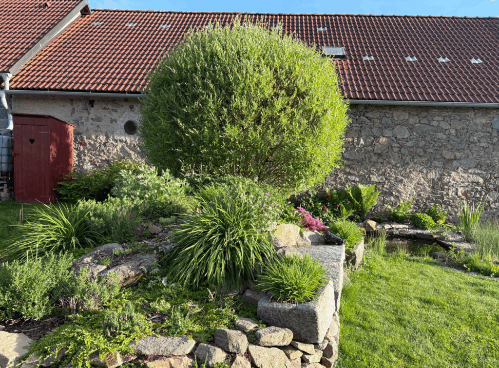 A právě za bývalou stodolou, když projdete chlévem nebo domem (dle libosti), najdete menší zahradu. Z okna kuchyně je výhled na dřevěnou “posilovací sestavu”, která loni vystřídala houpačky a prolézačky. Holt, děti rostou… Blízko kuchyně v kamenné spirále rostou byliny jako je máta, tymián, rozmarýn či saturejka. Na spirálu navazuje dešťový záhon, který pomáhá pozemku společně s jezírkem zvládat přívalové deště.