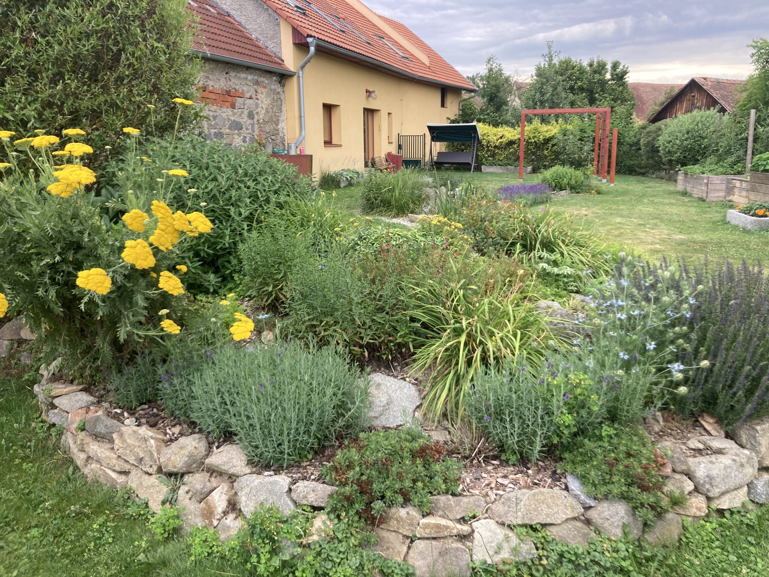 A právě za bývalou stodolou, když projdete chlévem nebo domem (dle libosti), najdete menší zahradu. Z okna kuchyně je výhled na dřevěnou “posilovací sestavu”, která loni vystřídala houpačky a prolézačky. Holt, děti rostou… Blízko kuchyně v kamenné spirále rostou byliny jako je máta, tymián, rozmarýn či saturejka. Na spirálu navazuje dešťový záhon, který pomáhá pozemku společně s jezírkem zvládat přívalové deště.