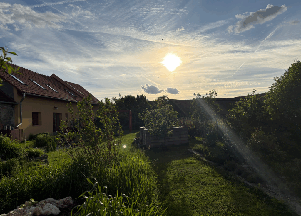 Manžel Ivety, Jirka (nyní profesí zahradník), se nezalekne žádné práce, což dokazují 4 vyvýšené zeleninové záhony, jezírko, kamenné posezení nebo dřevěná sauna (nejnovější přírůstek). Na pozemku najdete také paletové komory s kompostem a klasickou dřevěnou kadibudku. Vedle zahrady je štěpkou vysypaný výběh pro slepice, ty spolehlivě udržují tok živin v pohybu.